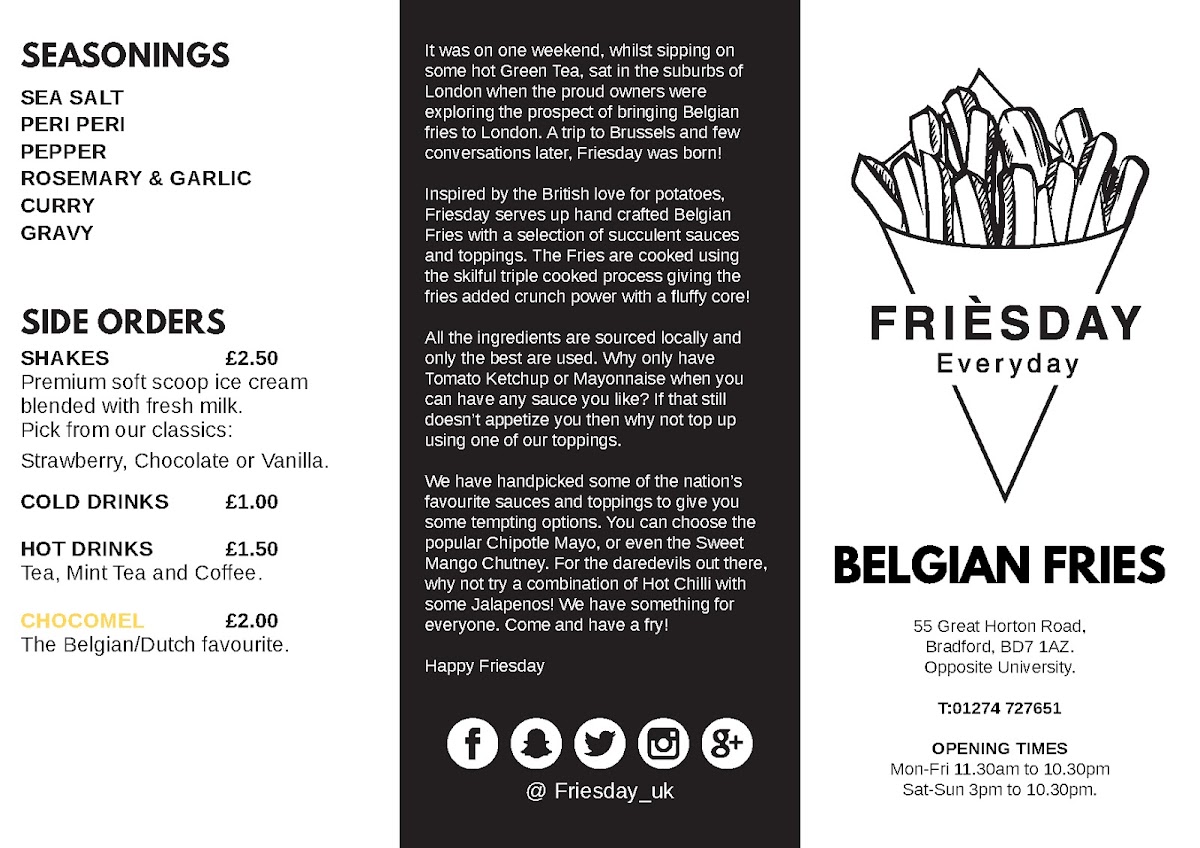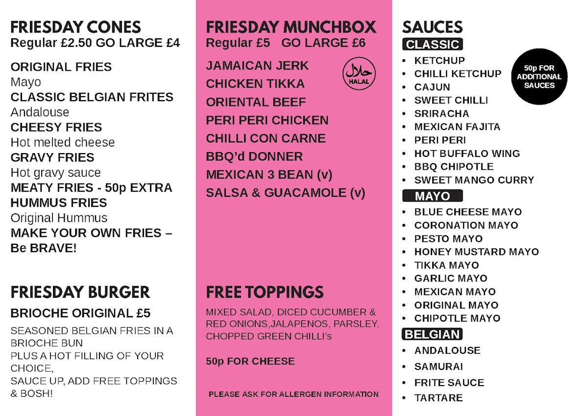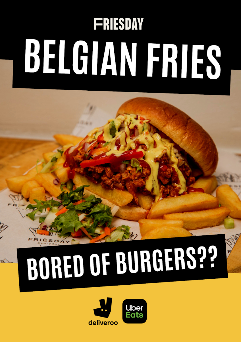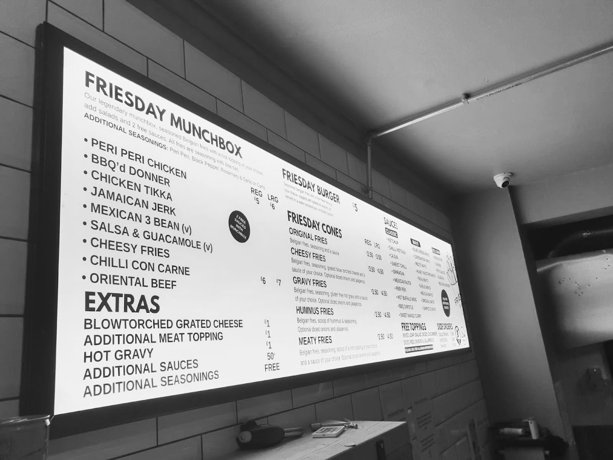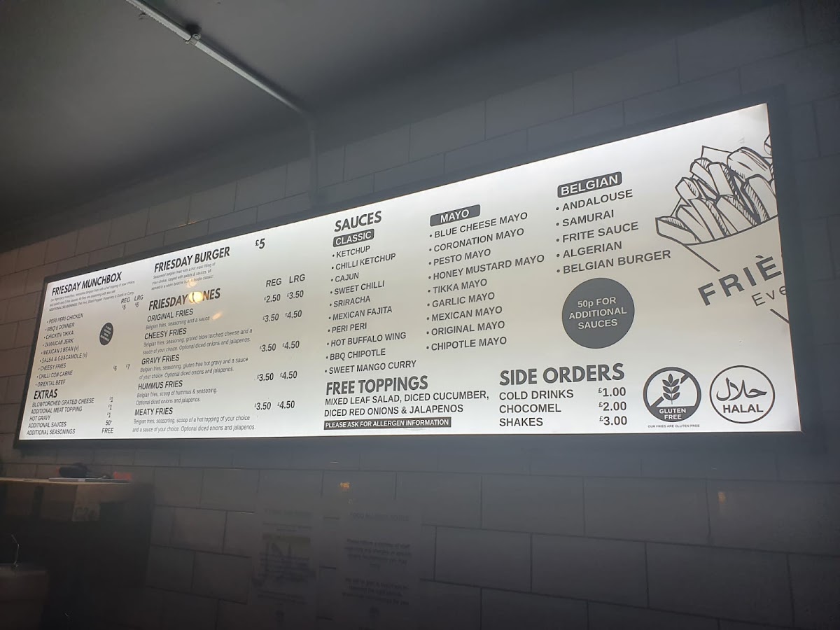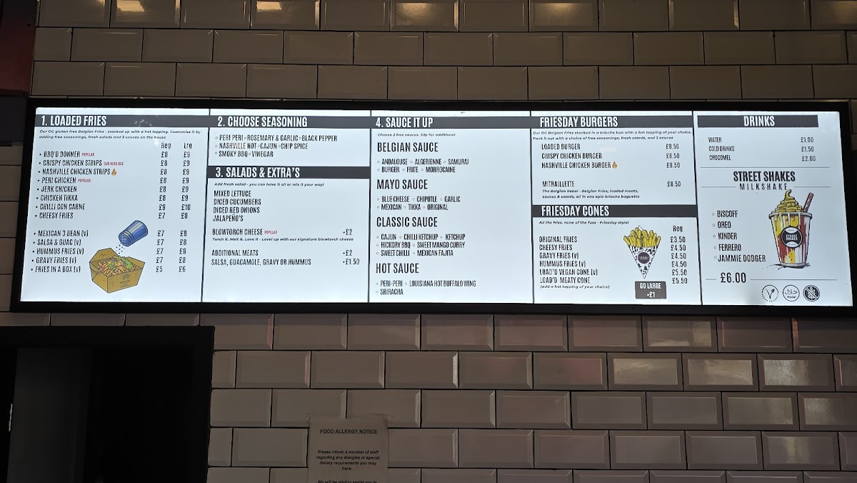 The menu at Friesday Belgian Fries offers a delightful variety of options for all tastes. Their Classic Munchboxes include Original Fries (with 2 Free Sauces), Cheesy Fries, and Gravy Fries (GF, Vegan), along with unique options like Hummus Fries. For those craving something heartier, the Loaded Fries are a must-try, featuring choices like BBQ'd Donner, Chicken Tikka, Crispy Chicken Strips, Nashville Hot Crispy Chicken Strips, and Peri Peri Chicken (H). If you're in the mood for a burger, the Friesday Loaded Burger, Crispy Chicken Strips Loaded Burger, and Nashville Hot Crispy Chicken Strips Loaded Burger are perfect picks. To complement your meal, extra sauces are available, including Classic Ketchup, Chilli Ketchup, Original Mayonnaise, Roasted Garlic Mayonnaise, and Sweet Chilli Sauce. For drinks, the restaurant offers Water, Rubicon Guava, Rubicon Mango, Kinza Cola, and Kinza Citrus. Don't miss out on their indulgent Street Shakes, such as the Biscoff Milkshake, Oreo Milkshake, Kinder Bueno Milkshake, Ferrero Milkshake, and Jammie Dodger Milkshake. With such a diverse and flavorful menu, Friesday Belgian Fries truly delivers a satisfying experience.