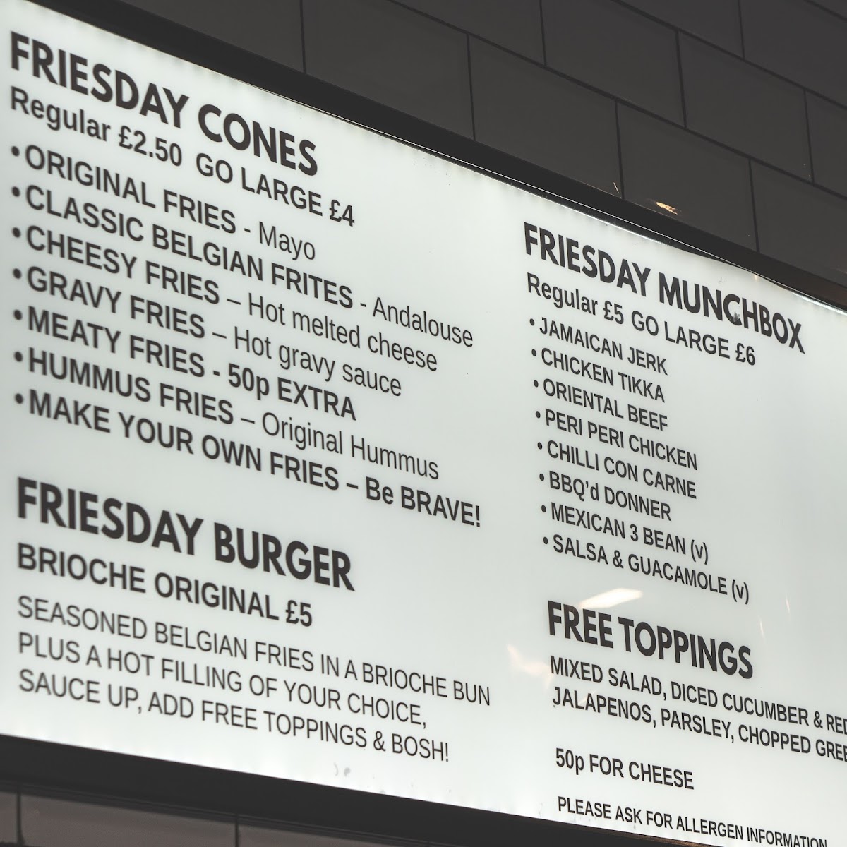 POPULAR Since Day One – Authentic Belgian fries in a Classic Munch Box, topped with our signature Friesday marinated Donner meat. Load it up with free salads and sauces of your choice!